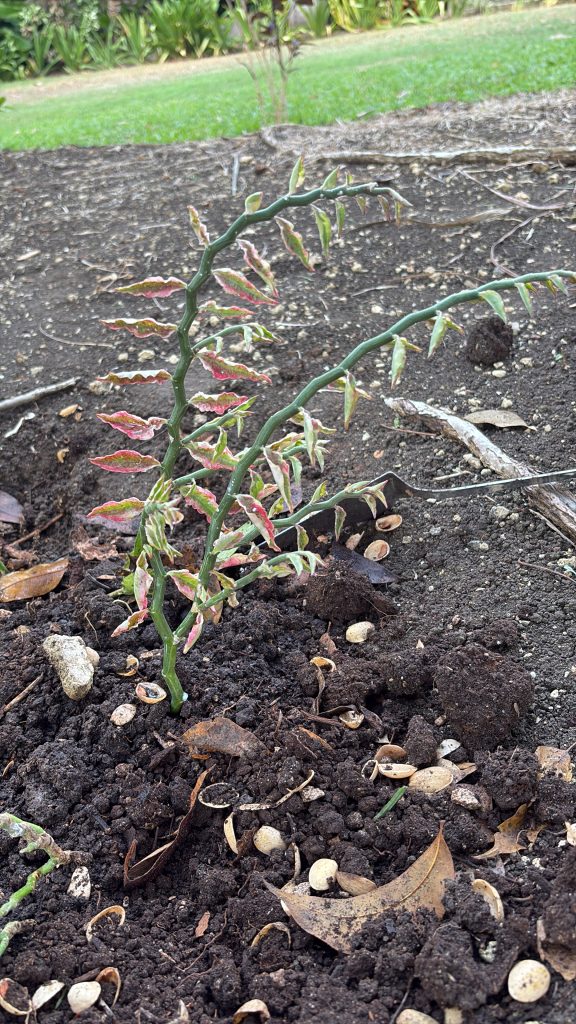 I’m told these are cut, plant and wait, bushes. So I set about some site preparation. Digging, mulching and dipping in rooting compound, I divided the cuttings into at least 10 different specimens. There were all lined up ready to go and in the trowel went and out quick as a flash our second centipede of the day. A monster. I leapt back and then with some force cut it in half with the trowel. Can you picture my horror when continuing to come at me with some pace were BOTH halves? …. The head bites and the tail stings I’m told. Euphorbia abandoned, but with great fascination from some distance I watched the two halves exist without each other, eventually after about 10mins they both came to a stuttering halt… the tail end first.