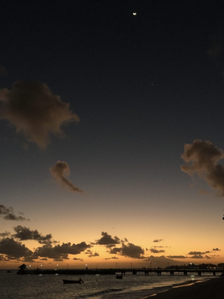 The sun sinks towards the horizon, the sky rapidly darkens as it does in the tropics, and we very nearly call it a day and head home, but I persuade Nicola to change into her cozzie and we slip into the briny waters. They’re beautifully warm and, despite the encroaching dusk, amazingly clear. We see right to the bottom as we swim out to sea under dramatic clouds and a bright crescent moon. A simply glorious end to a momentous weekend.