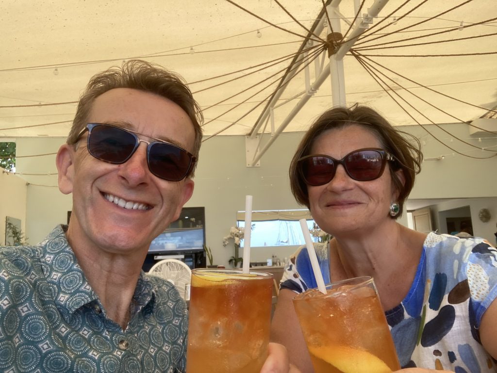 Over the head of the auctioneer and through the burglar bars we can see the sea is sparkling. Actually, we have an anniversary to celebrate and rum to drink, standing on the hot staircase for who knows how long is very unappealing, so we bail and head to the sea…..