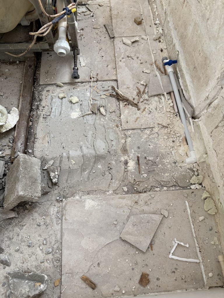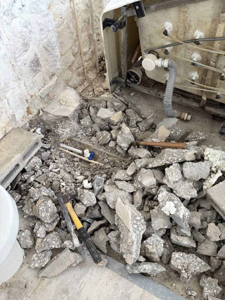 So the demolition is progressing, the network of taps under the bath, coming from the outside, or the wall or the sink is confusing at best. Old pipes, new pipes, hot pipes, cold pipes, capped off pipes and very much alive pipes.