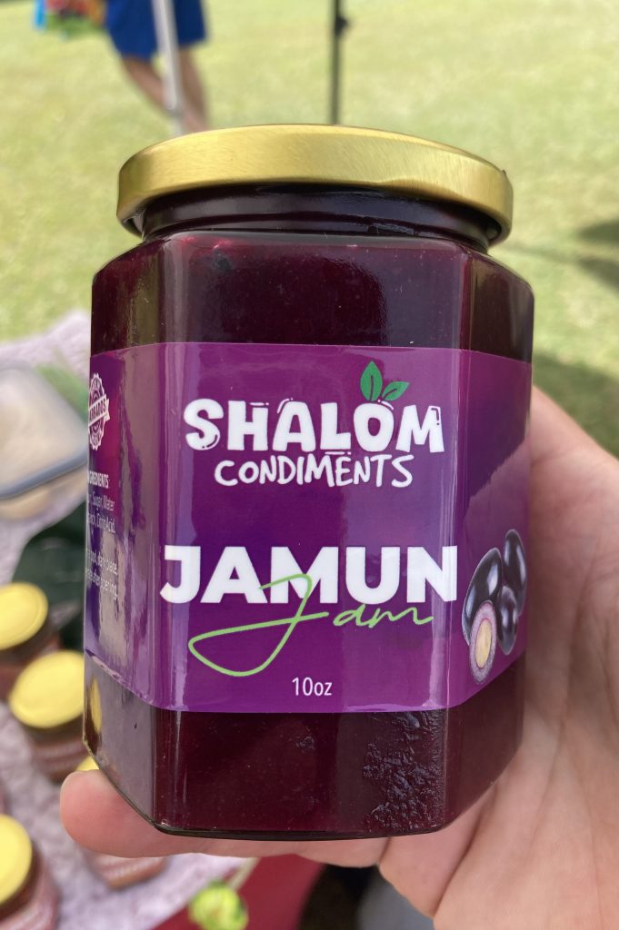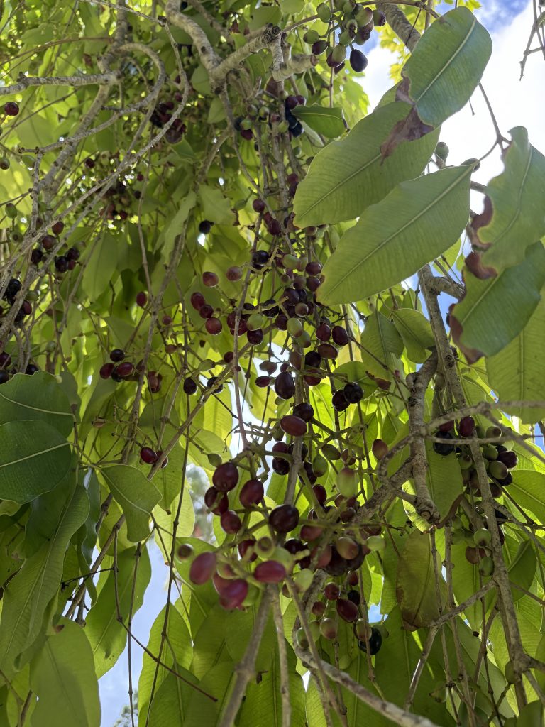 On Saturday morning we heaved our arses out of bed early and made the short journey to Brighton Farmers’ Market. We have befriended some of the stallholders and one of them, Lora from Shalom Condiments, knows that we have a jamun tree which fruits at this time of year. Also known as Java plum or black plum, the tree bears LARGE numbers of small dark fruits. Perfect for a condiment producer. So, last week Lora paid us a visit and proceeded to ‘shake the tree’ good and proper: