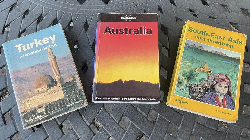 Those two words have a special place in the heart of every independent traveller of a certain vintage. Nicola and I are among many who, from a tender age, hoisted our backpacks and hit the road in search of adventure with one of this publisher’s travel guides tucked under our arm. Overnight visitors to our home over the decades have slept under the watchful gaze of the ever-expanding Lonely Planet library gazing down from a high bookshelf. Here are our first three volumes from early adventures: 1985 (me), 1988 (Nicola) and 1990 (me again). Each holds a treasure trove of memories. We’ll never part with them.