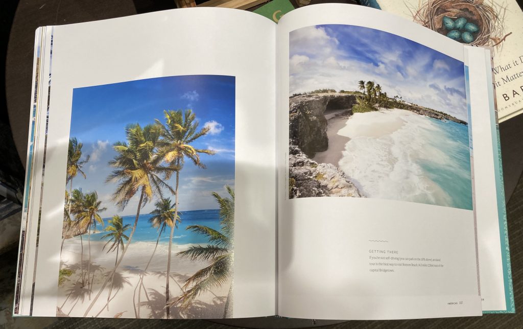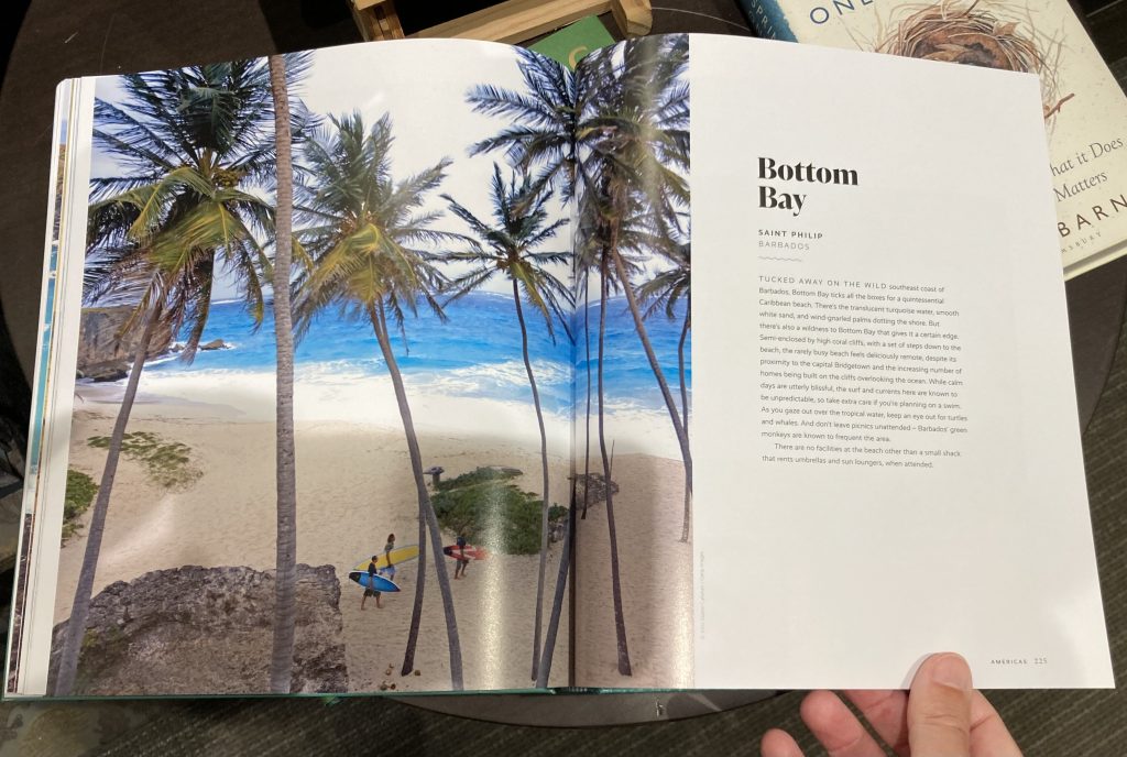 Irresistible! Curiosity propelled me to the section on the Americas where the following pages leapt out at me. Ladies and gentlemen, I give you arguably the most beautiful beach in Barbados, which is less than 15 minutes’ drive from Pollards Mill: