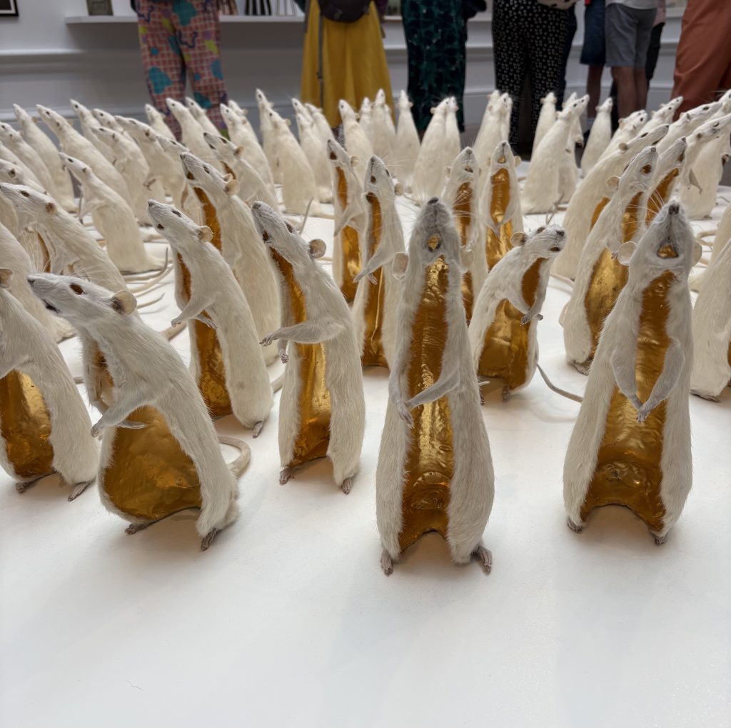 Needless to say the award winning (Zatorski +Zatorski) sculpture of 101 rat pelts lined in 24k gold had not been sold but it was also way over budget £85,000 … gross IMHO. My choice a whimsical self portrait “Festival” by Gillian Wearing RA came in just under budget.
