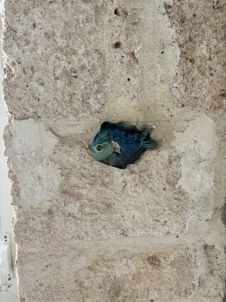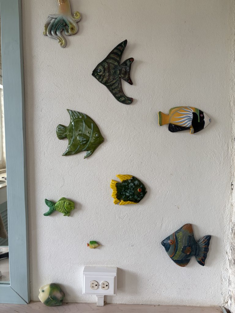 Painting done, and moving on to the final touches ….making an appearance after a very long time, and now in a starring role is my fish collection. Once filling the wall in the bathroom in my pre-marriage abode, these fish have been wrapped up safely waiting for their moment to shine again. It has arrived. Having spent a couple of decades in the attic and then crossing an ocean on a ship, it was amazing to see them looking in fine fettle and wonderful to unwrap them, each a memory of a holiday, one of my own creations, the fishy section of a quirky little shop, or a gift from a friend.