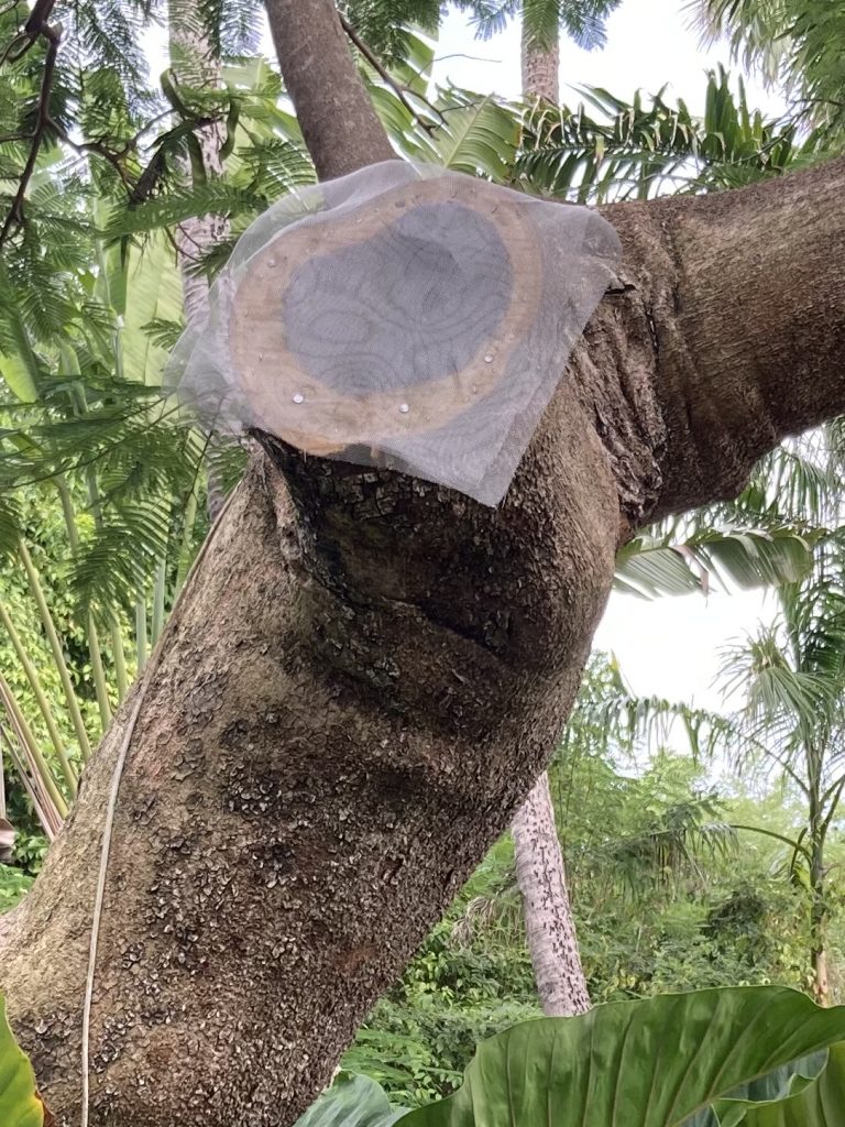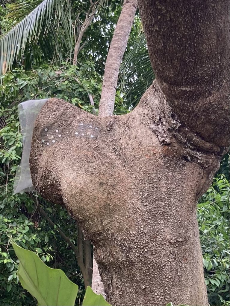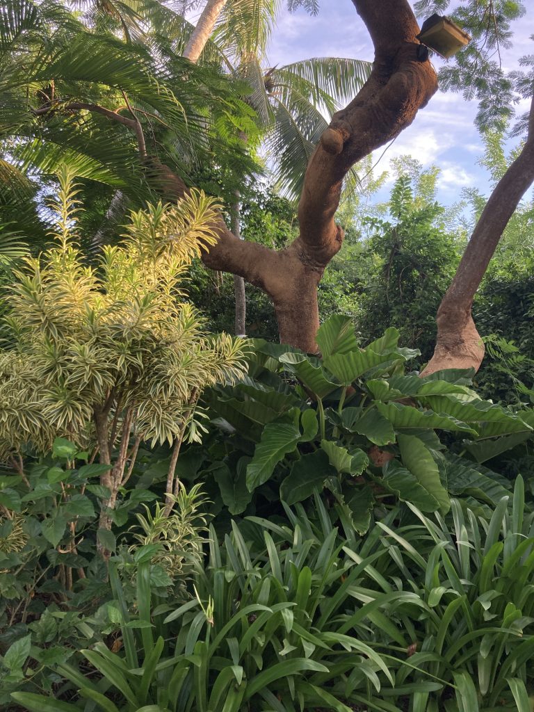 After lengthy consultation with our pest controller Joel and declining a couple of laughable quotes from the aforementioned charlatans, we reluctantly accepted that the hive was too deep inside a hollow tree branch and couldn’t be moved. We are very much aware of the critical importance of bees to the world’s ecosystem and would only ever consider exterminating a hive as a last resort, so we very reluctantly asked Joel to take care of them for us, which he did, blocking a couple of holes in the tree and sustaining a couple of stings for his trouble – an occupational hazard. He drew our attention to a very large branch with a gaping hole in it, advising us to have it removed. Not being in possession of a huge chainsaw, we tried to find a tree surgeon but ran out of time before leaving the island.