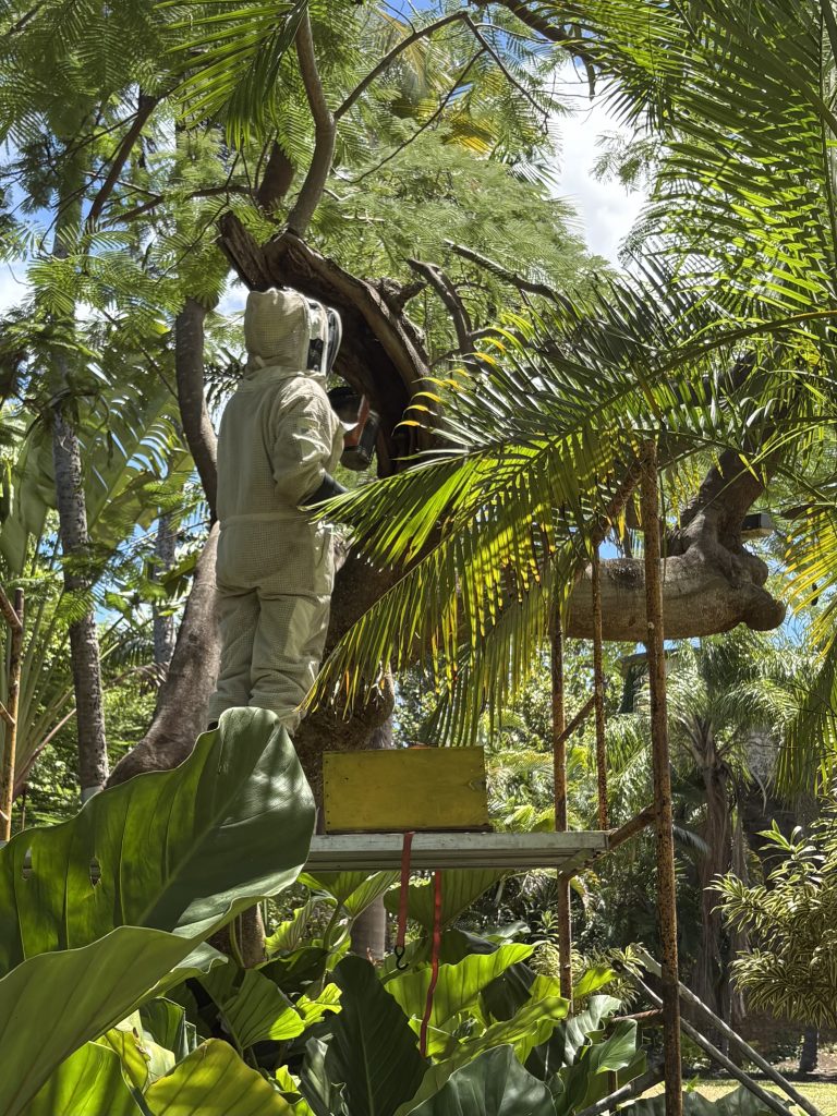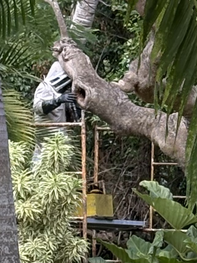 So, naturally, when we returned in August there was a massive wild hive in the hollow branch of the tree 🙄. We have co-existed happily with these new bees, each community leaving the other in peace, no kitchen invasions or stings. Doing our little bit for the planet (to be fair the bees were doing all the work). Then last week our gardener Jason got spooked by the hive and summoned his bee man Aaron. Trusting in Jason’s judgment we agreed to Aaron’s very reasonable quote to move (not destroy) the bees. He came along last Saturday.